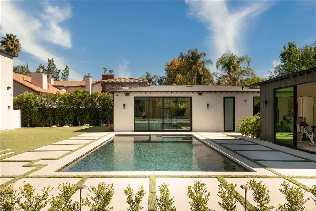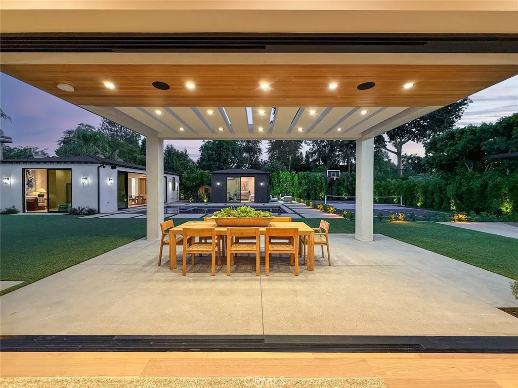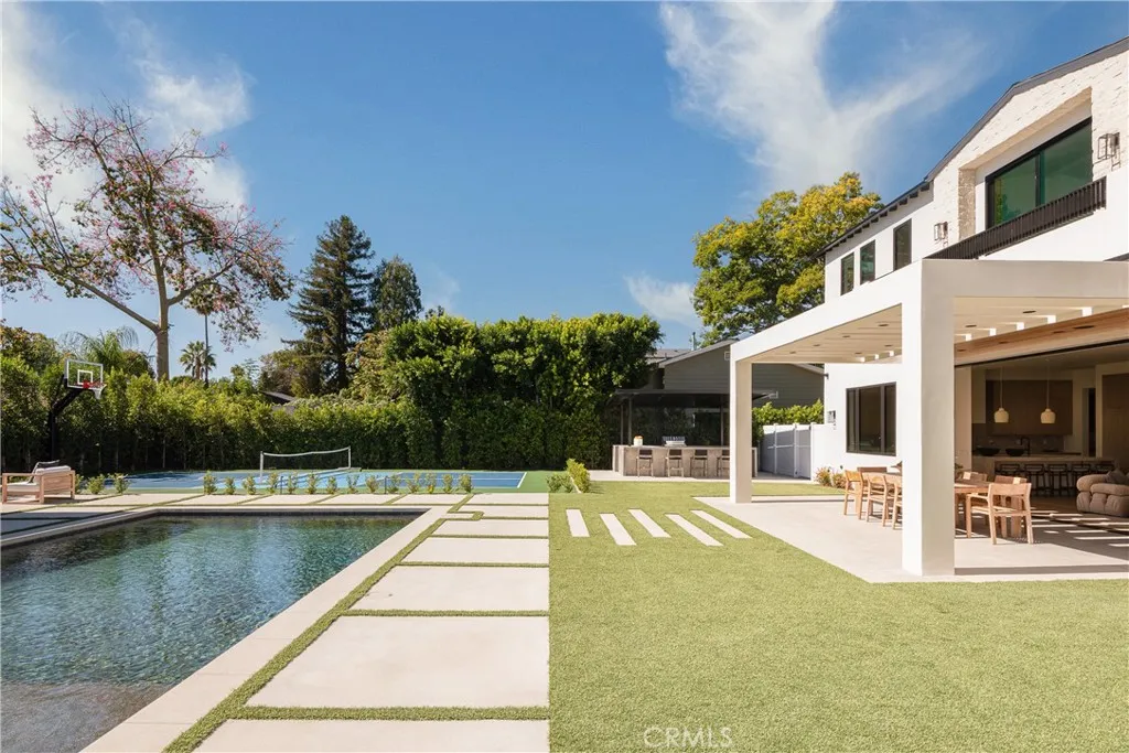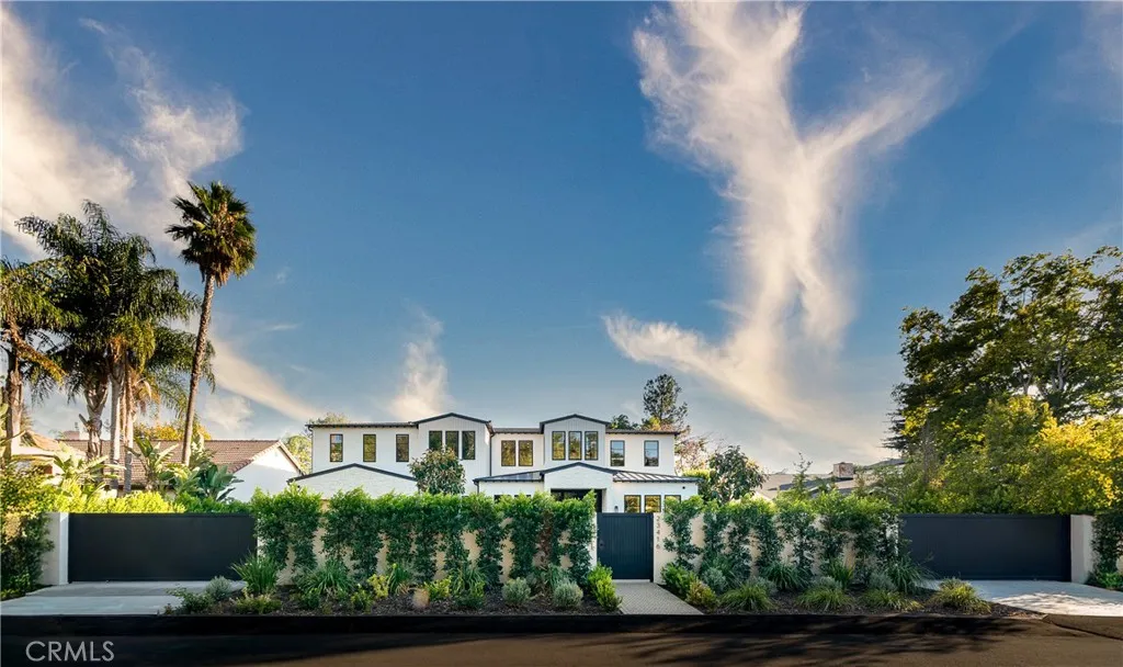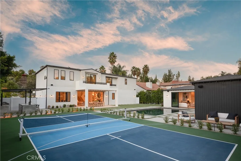 Welcome to this exquisite gated estate located in Woodland Hills, Walnut Acres, on one of the quietest streets. This recently built luxury property offers 6,418 square feet of living space on an 18,338-square-foot lot, making it ideal for entertaining. The main residence spans 5,369 square feet and includes five bedrooms, each with its own en-suite bathroom, plus an additional guest bathroom. Other spaces include an office, a theater room, and convenient laundry facilities on both levels. Enjoy stunning balcony views from both the primary suite and the family room. Additionally, the property features an 830-square-foot guest house with a private large bedroom, en-suite bathroom, full kitchen, and laundry facilities. The expansive backyard perfect for entertaining includes a separate detached 219-square-foot gym, sauna, sports court, pickleball court, and a covered outdoor barbecue area, ideal for large gatherings.