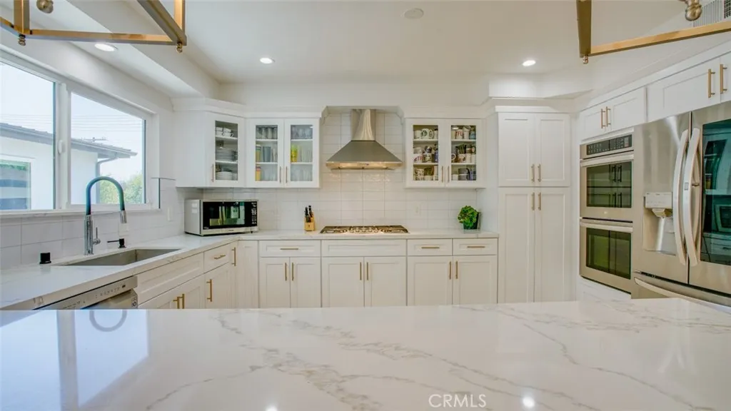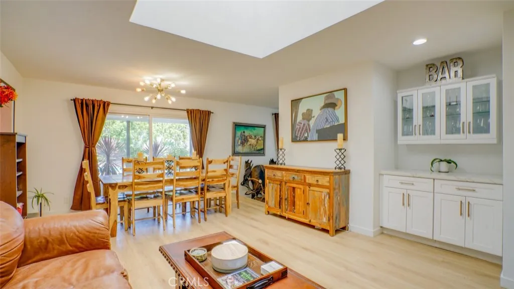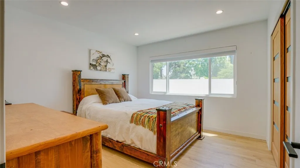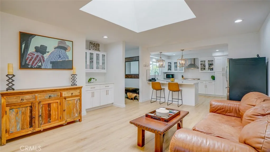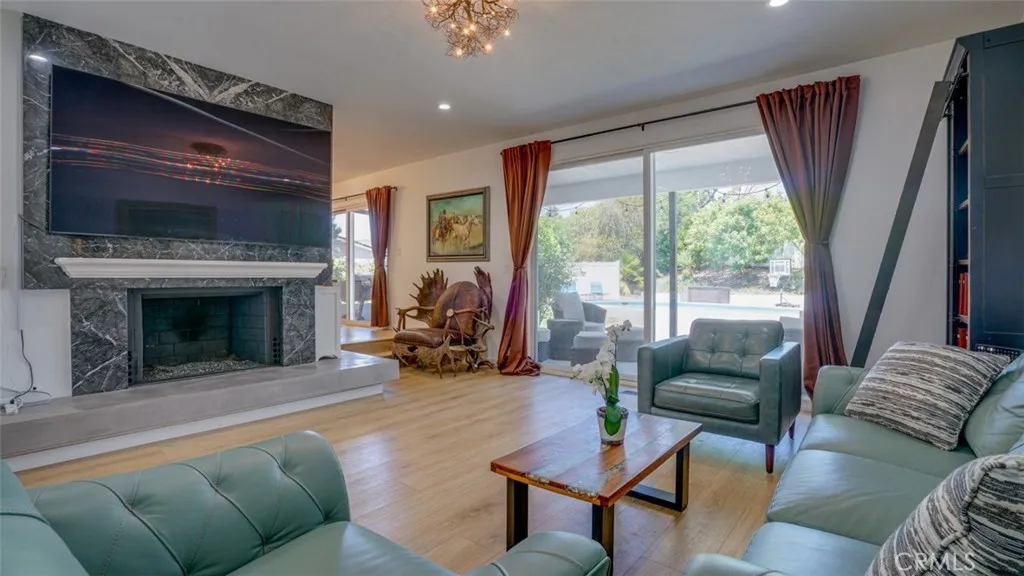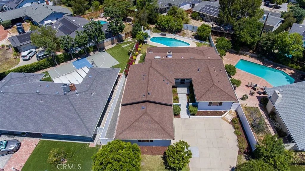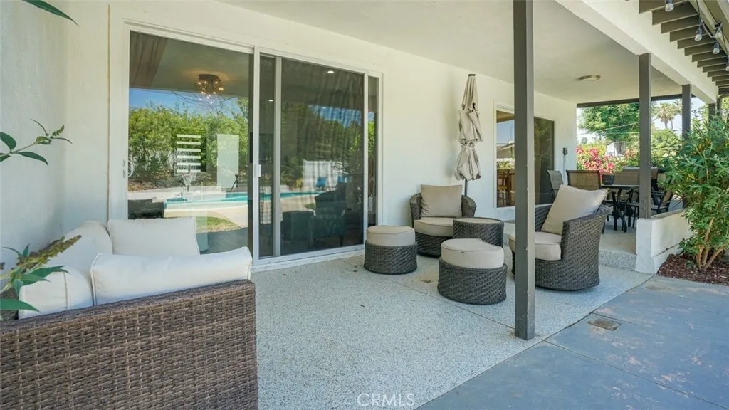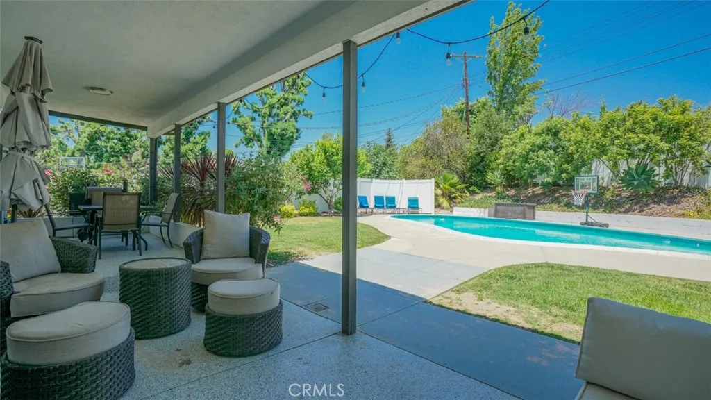 Located in a sought-after neighborhood within the acclaimed Woodland Hills school district, this beautifully updated 4-bedroom, 3-bath home is move-in ready and filled with stylish details and modern conveniences. Step inside to a bright, inviting layout featuring a sunken living room with a gorgeous marble fireplace and direct access to the spacious patioperfect for indoor-outdoor living. The open-concept kitchen boasts quartz countertops, stainless steel appliances, ample cabinetry, and a generous island with bar seating. It flows seamlessly into the family room with a built-in bar and a dining area with sliding doors leading to the backyard. The primary suite features double closets and a luxurious en-suite bathroom. Two additional generously sized bedrooms share a beautifully updated full bathroom. In the hallway, you will find a bonus extra-large walk-in closet. The fourth bedroom located off the kitchen and laundry room has a separate entrance from the outside, a private bath and bonus office area. This space is ideal for multi-generational living, a home office set-up, guests or a rental. Additional highlights include a 2025 HVAC system, brand new fencing and a 2024 tankless water heater along with laminate flooring, fresh interior paint, dual-pane windows and copper plumbing. It features a large laundry room with ample storage and an updated 2-car garage with polyurea flooring, drywall, and abundant storage. Step outside to the entertainers backyard complete with a sparkling pool, expansive covered patio with polyrea flooring, lush landscaping and a grass areaideal