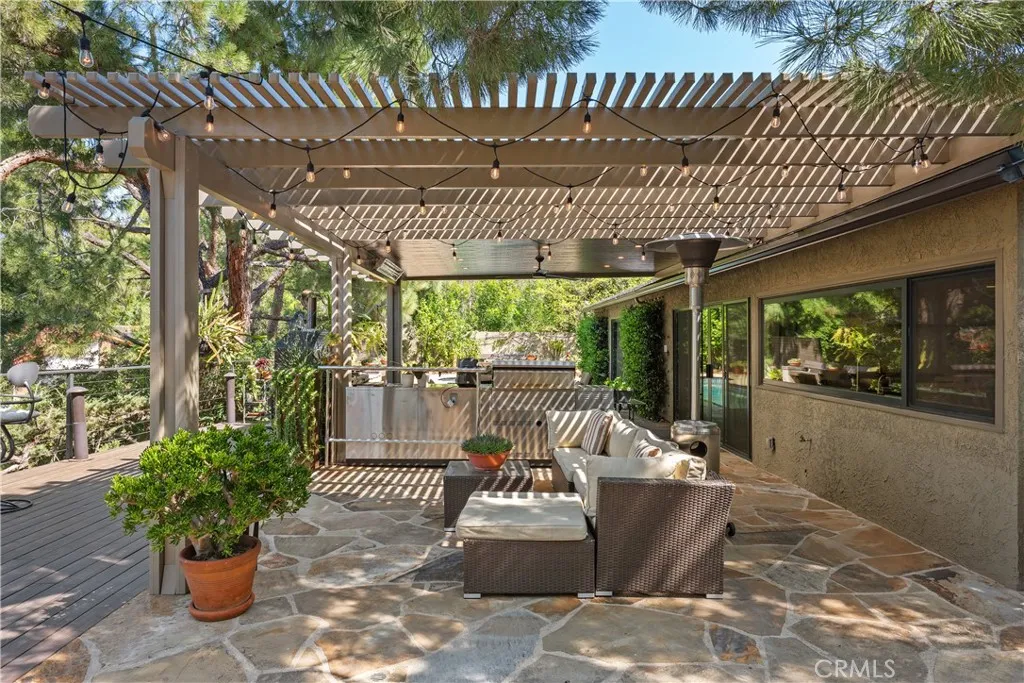 This absolutely stunning 4 bedroom, 3 bath, gated home has views of Warner Center and truly leaves nothing to be desired. A stone driveway and winding path lead to a custom glass front door, opening into a beautifully renovated single story home that seamlessly blends elegance and comfort. The dramatic two-story living room features an artistic spiral staircase leading to a loft, creating a striking architectural focal point. The gourmet kitchen, renovated in 2025, is a chefs dream, showcasing top-of-the-line Thermador appliances, sleek porcelain countertops, and an oversized center island with a breakfast bar. Expansive corner windows frame breathtaking views and effortlessly bring the outdoors inside. The kitchen opens to a spacious family room, warmed by a cozy fireplaceperfect for everyday living and entertaining. Wide-plank wood flooring and travertine flow throughout the home. Double doors welcome you into the serene primary suite, complete with a generously sized, custom-built closet. The spa-inspired primary bathroom, renovated and gorgeous, features quartz countertops, dual sinks, and a luxurious steam shower with dual shower heads. This home boasts numerous upgrades, including owner-paid in full solar with a battery backup, updated pool equipment and lighting, electrical panel, intercom and cameras, a newer 2026 roof, and more. The incredible covered outdoor kitchen completed in 2025, offers heating and a ceiling fan, allowing for year-round enjoyment. Private and serene, the grounds are nothing short of magical, day and night. Watch breathtaking sunsets, gather a