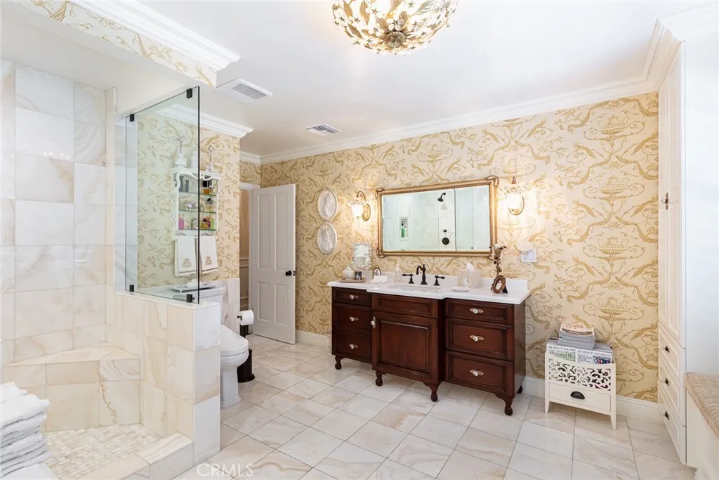 Experience the dazzling restoration of this rustic style single-level ranch affording a classic olde Hollywood vibe. Situated on a flat nearly half-acre of sensational grounds featuring over 150 ft. of gated frontage adorned with roses, circular drive, brick accents, lush lawn & slate roof. Love at first sight is a quite the possibility here. An incredible over 600 sq. ft. guest house elevates it to another level. Both inside and out, the vision and style of its proud owners are prominently displayed. Gorgeous wood flooring blankets the interior. Living room with an inviting fireplace and the allure of original A-framed wood ceilings define this cherished space. A spectacular dream kitchen offering custom cabinetry, quality appliances and a massive center-island with exquisite Palomino granite adjoins a gorgeous butlers pantry. Spacious & bright family room & formal dining benefit from a beautiful brick fireplace. Unique convertible den is a favored destination enhanced by a distinct curved fireplace. Your amazing primary-suite delivers a refined walk-in closet, French doors to the rear & an ultra-luxurious bath where white onyx walls & floors, soothing spa tub & a 6 shower provide a true haven within. Two additional en-suites with stunning baths are sure to please. Outside, these glorious grounds truly rival that of a 5-star resort. Refreshing solar-heated pool and spa framed by the elegance of concrete decking with faux grass definition is just divine. An ideal covered dining and relaxation area offer a cozy fireplace & T.V. Bountiful fruit trees and a basement/storage ro