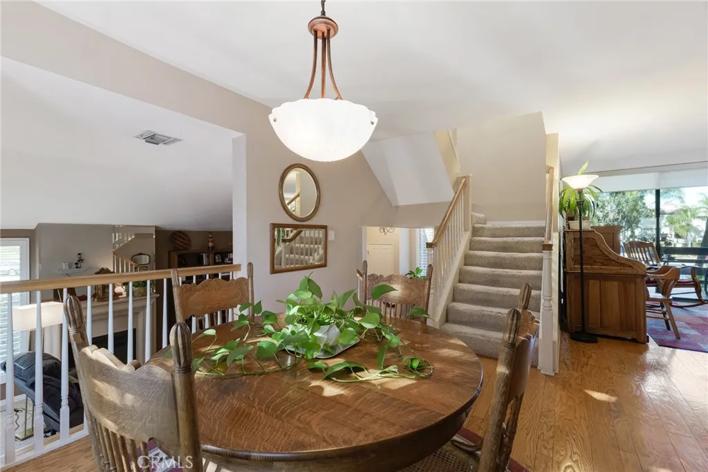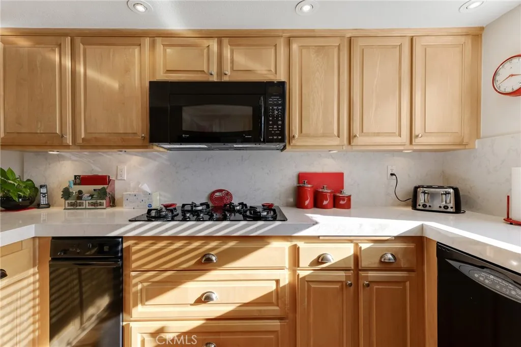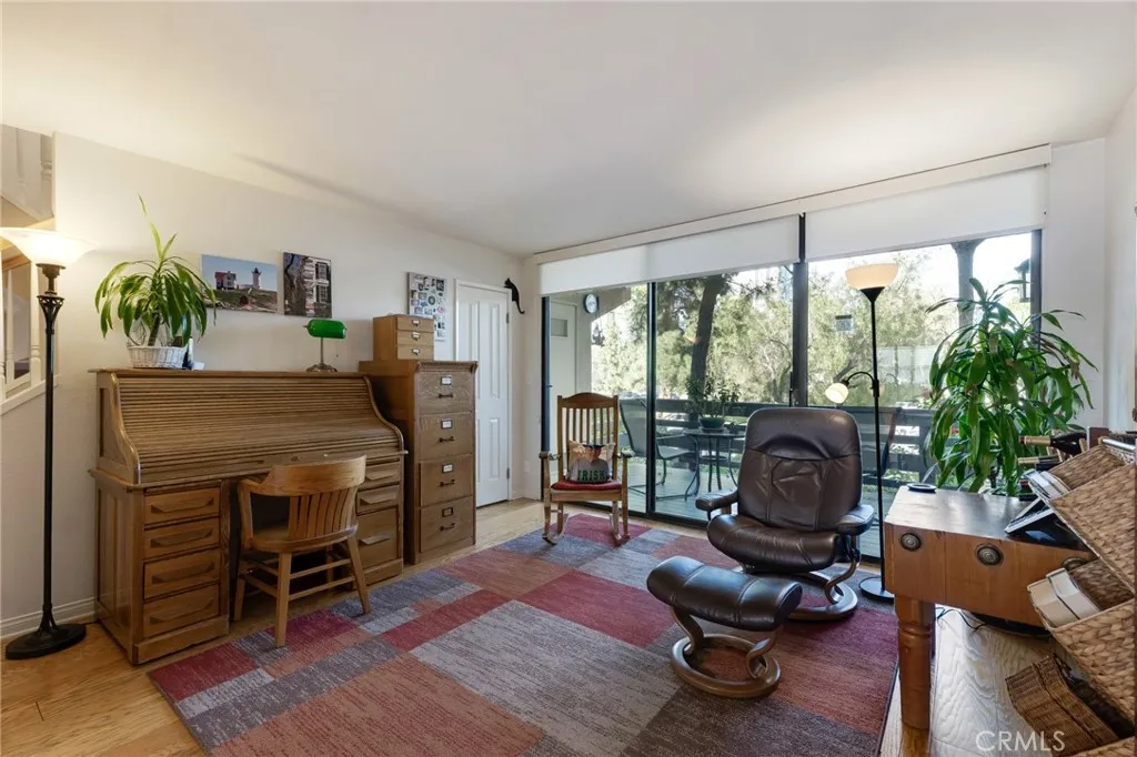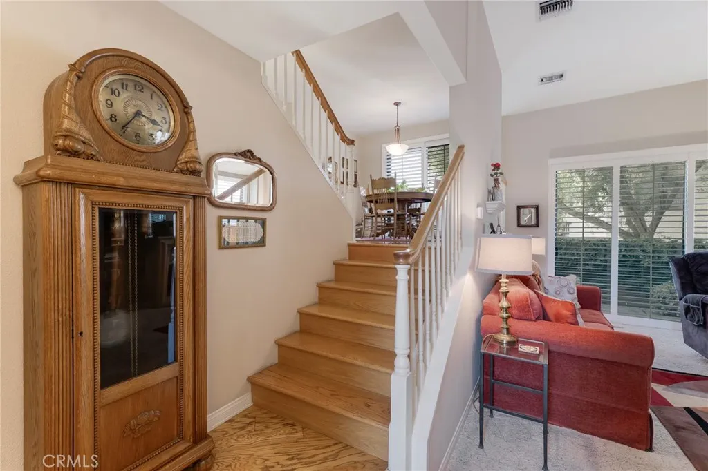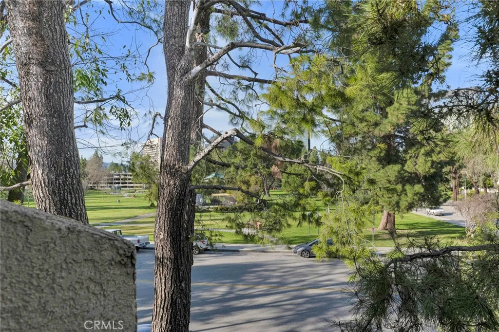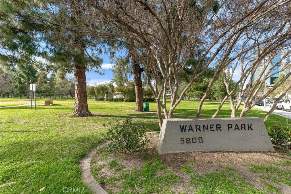 Located within the desirable Warner Village community in Woodland Hills, this beautifully situated end unit townhome offers exceptional privacy facing the tranquil greenspaces of Warner Center Park and only one shared wall. With nearly 1,800 sq ft of living space and four private outdoor areas, this 3 bedroom, 2.5 bath residence features a split-level layout, soaring ceilings, and abundant natural light throughout. Double doors open to a welcoming foyer with a convenient powder bath for guests. Step down into the formal living room highlighted by vaulted ceilings, a central fireplace, and oversized sliding glass doors leading to an enclosed patio. A short flight up reveals the formal dining room with sightlines to the living area and sliding doors opening to a balcony. Adjacent, the kitchen is appointed with maple cabinetry, quartz countertops, built-in gas range with overhead microwave and vent, wall oven and broiler, dishwasher, and trash compactor. The adjoining family room offers generous proportions and wall-to-wall sliding glass doors that open to a deck overlooking a peaceful, trickling stream. Wood flooring extends across the main and mid levels (with carpet in the formal living room), while carpeting continues on the stairs and upper floor. Downstairs from the foyer, a flexible bonus room (not included in total square footage) is ideal for a home office, studio, gym, storage, or potential fourth bedroom, complete with a dedicated laundry area and direct access to the 2 car garage featuring built-in storage cabinets and a newly installed electrical panel (late 2025)