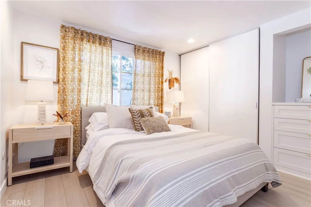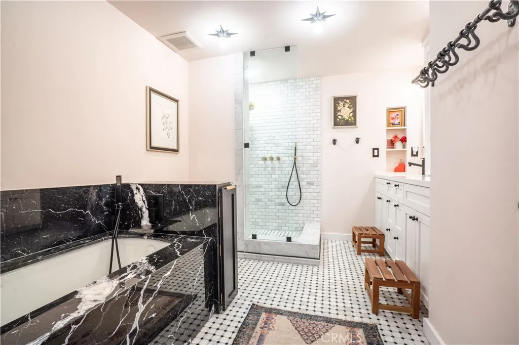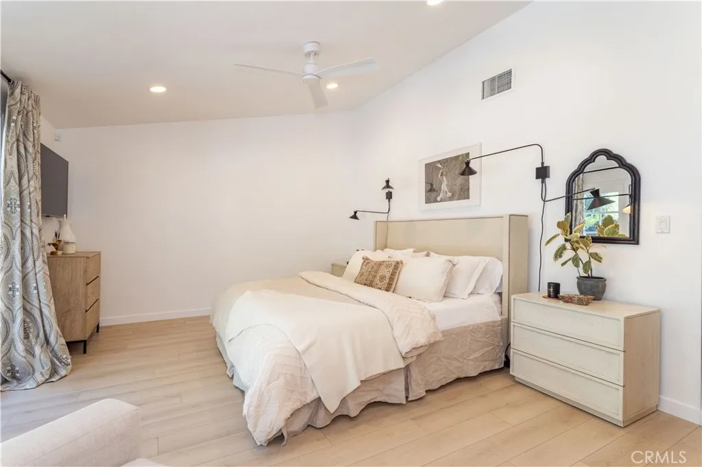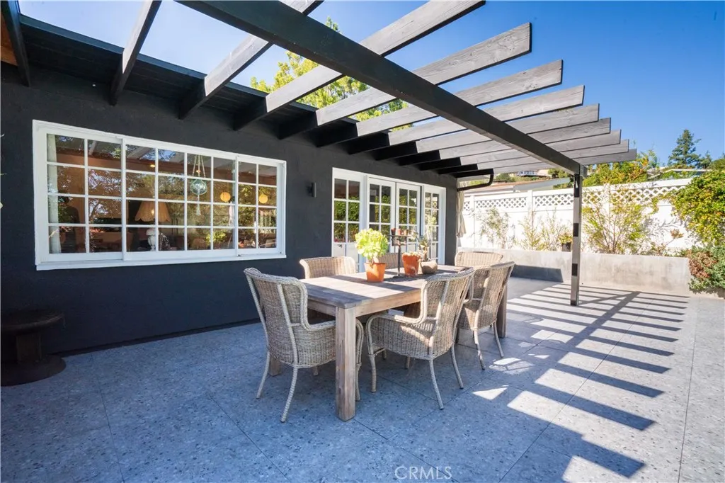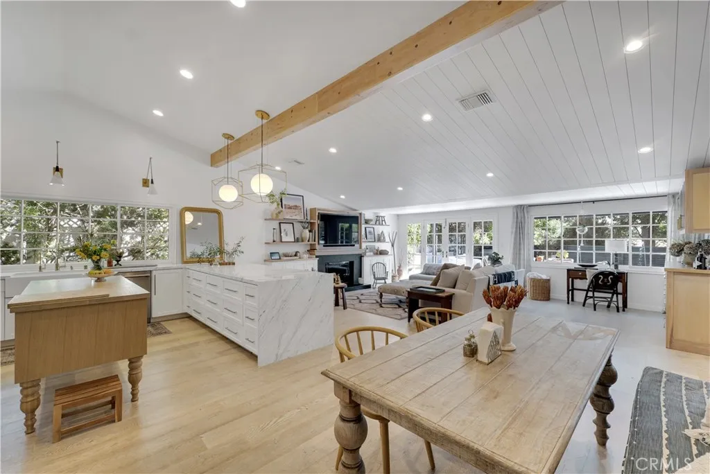 Stunning Mid-Century one story ranch seamlessly blends timeless charm with modern elegance. This is an interior designers home, every detail of this home has been carefully curated for style and functionality. A beautifully landscaped front yard sets a serene tone as you approach this 3,080-square-foot home, situated on an expansive 11,286-square-foot lot. Offering five bedrooms and four bathrooms, the layout is both spacious and versatile. The fifth bedroom and bath are privately positioned apart from the others, making it ideal for guests, extended family, or home office. The primary suite is a true retreat, featuring a walk-in closet plus an additional floor-to-ceiling closet space and French doors looking at the backyard. Its newly renovated ensuite bathroom boasts double sinks and a stunning marble shower. The additional bedrooms are generously sized, each offering ample closet space. One bedroom features a custom-built bunk bed, perfect for kids or anyone seeking a cozy, private space to read and relax. At the heart of the home, the open-concept kitchen is a chefs dream. Designed with soaring ceilings, an exposed beam, and custom cabinetry adorned with unlacquered brass handles, this space is both elegant and practical. Premium Thermador appliances, including a six-burner stove, extensive counter space, a custom wood center island, and an inviting eat-in kitchen area. The kitchen seamlessly flows into the great room, featuring a custom fireplace surround, built-in dry bar, and French doors that open to the backyardcreating a warm and inviting atmosphere. Step outside