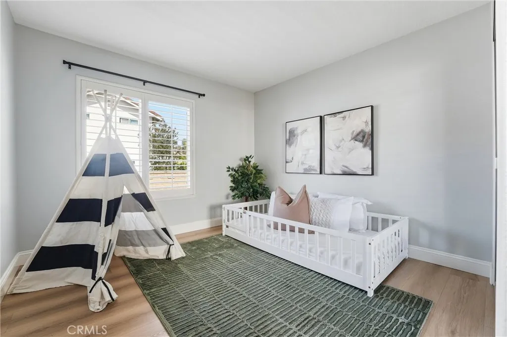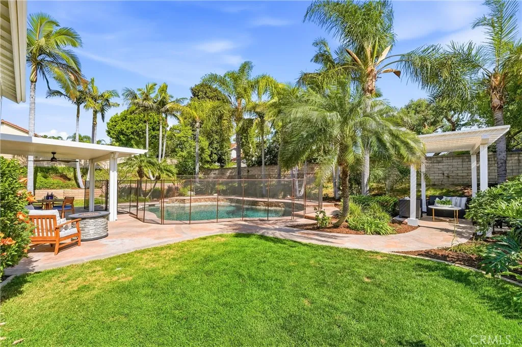 This stunning home blends elegance and comfort, featuring impressive curb appeal, a beautifully upgraded interior, and a resort-style backyard with pool and spa. A private entry foyer welcomes you with soaring cathedral ceilings, architectural arches, and an abundance of windows that fill the home with natural light, highlighting the gorgeous plank flooring throughout. Nearly every room offers scenic views of mature palm trees and lush landscaping. The spacious floor plan includes 5 bedrooms, including a highly desirable main-floor bedroom with a walk-in closet and custom built-ins. The main-level bathroom features a walk-in shower with custom stone finishes. The fully remodeled kitchen is a chefs dream, showcasing quartz countertops, shaker cabinetry, a large center island with custom storage, dual ovens, coffee bar, and an expansive walk-in pantry, overlooking the beautifully landscaped backyard. Cathedral ceilings enhance the formal living and dining rooms, both offering picturesque views of the front and rear grounds. The family room opens seamlessly to the kitchen, creating an ideal space for gathering and entertaining. Upstairs, the grand primary suite features vaulted ceilings, large windows, and tranquil backyard views. The en-suite bath includes stone accents, a soaking tub, dual vanities, and a spacious walk-in closet. The secondary upstairs bedrooms are generously sized, including one oversized room with vaulted ceilings, a window nook, and walk-in closetperfect for flexible use. The backyard is an entertainers dream, offering multiple areas for dining, lounging