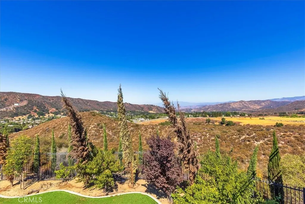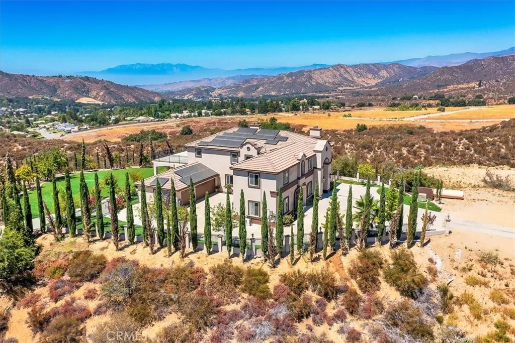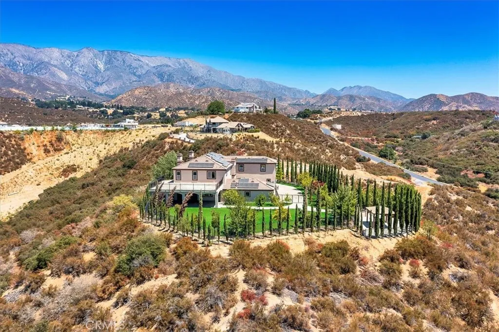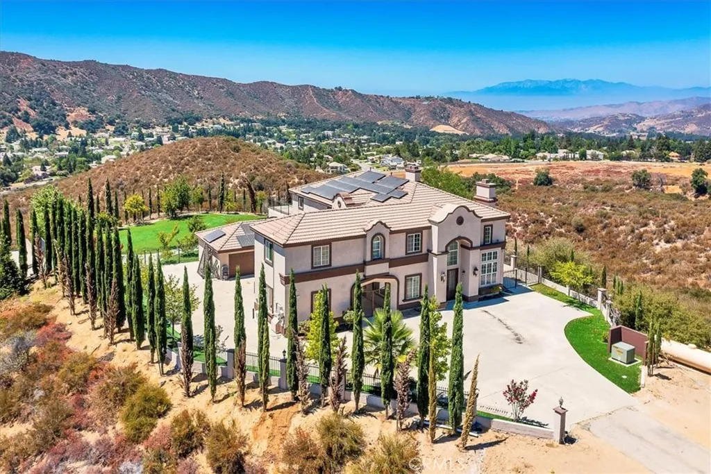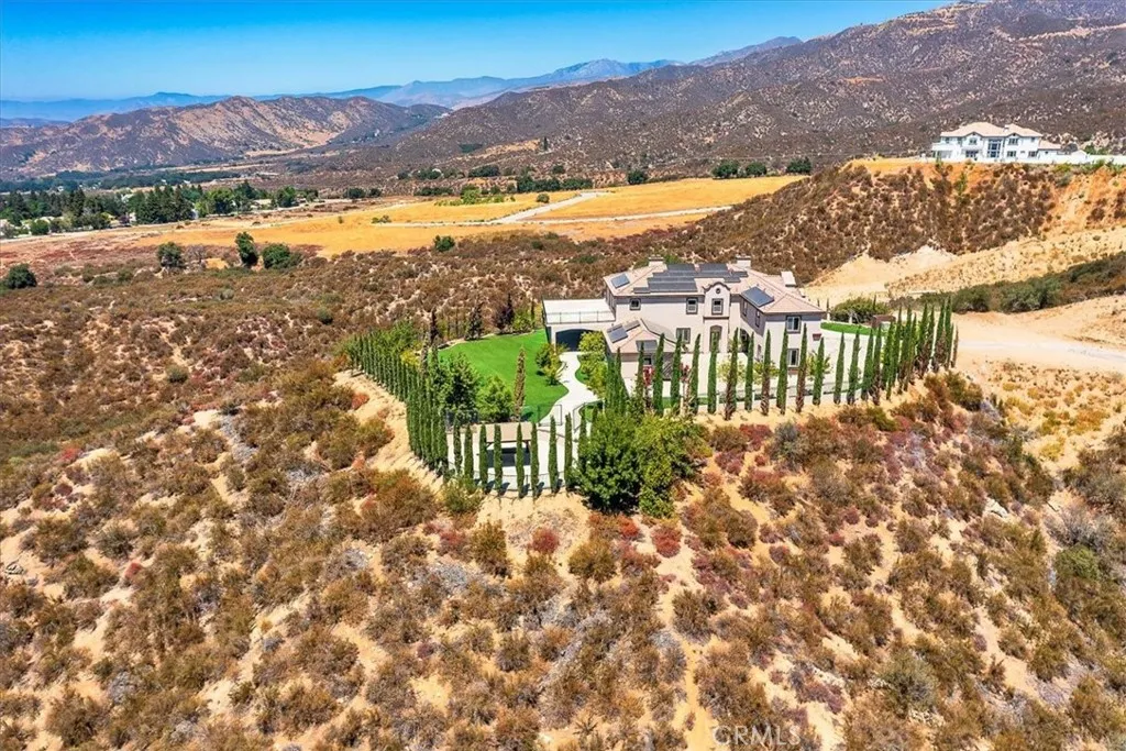 Welcome to 39292 Butterfly Drive, a custom estate perched on nearly 5 acres in the prestigious gated community of Wildwood Highlands. Nestled near Wildwood State Park and just minutes from Oak Glens wineries and apple orchards, this home combines timeless elegance with breathtaking surroundings. A grand porte cochere and double-door entry set the stage for the dramatic foyer, complete with soaring ceilings and a dazzling crystal chandelier. Real wood floors flow throughout the main level, where youll find an office, 1/2 bath, convenient laundry room with sink, and a detached guest room with its own private full bath, ideal for extended family, guests, or future ADU conversion. Upstairs, discover 4 bedrooms and 3 bathrooms, including the luxurious primary suite, a retreat featuring a private sitting area with fireplace, spa-like bath with soaking tub and glass shower, and an expansive deck showcasing panoramic valley views framed by snowcapped mountains. The gourmet kitchen is a chefs dream with a large island, granite counters, GE Monogram appliances, six-burner gas range with hood, double ovens, trash compactor, and a spacious walk-in pantry. Three fireplaces add warmth throughout, while the finished 3-car garage impresses with epoxy flooring and insulated doors. Outdoors, enjoy the fully fenced yard lined with Italian Cypress, mature fruit trees, low-maintenance artificial turf, and a large covered patio with ceiling fans. A private covered observation area is perfect for gatherings or a future outdoor kitchen. Energy efficiency abounds with 61 paid-off solar panels, 3 Te