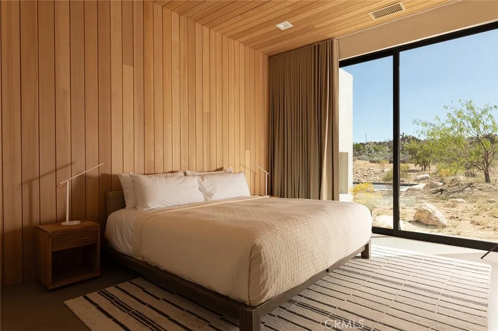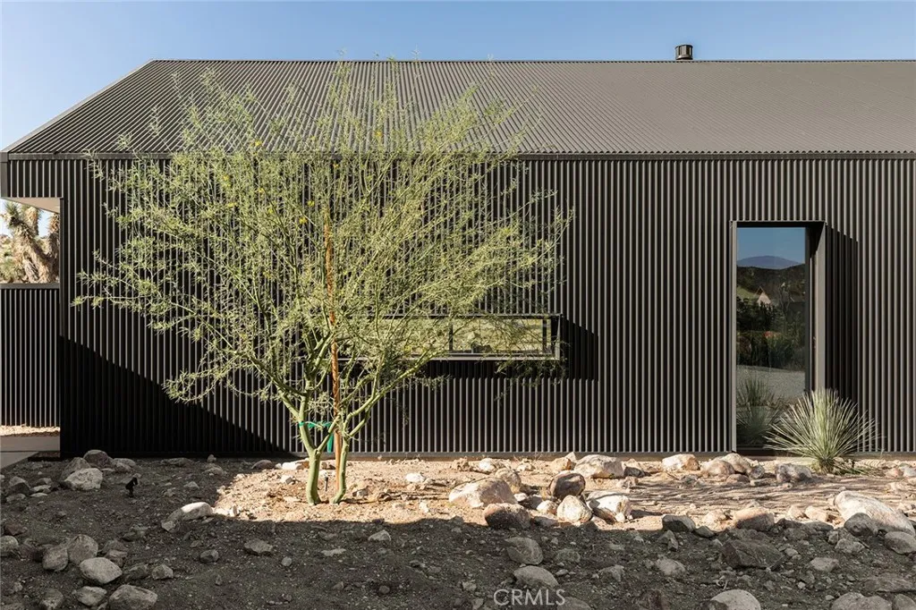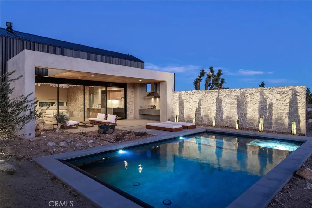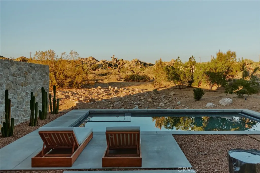 Picture-perfect and income producing, this 3 bedroom, 2 bathroom modern luxury home (built in 2023) is being offered fully furnished and turn-key. Currently operating as a high-performing short-term rental, the property offers both a dream desert lifestyle and the opportunity for a strong income-producing investment with potential bonus depreciation tax advantages for end-of-year buyers (buyer to independently verify). Set on 2.29 acres in a quiet Yucca Valley enclave, the home is designed for the best of both worlds: privacy and expansive desert views. Around the pool and bedrooms, strategically planted mature trees create a lush sense of seclusion and a resort-like luxury privacy experience. Enjoy unobstructed vistas of Joshua trees, open desert, and distant mountain ranges. The pool area is framed by dramatic boulder views, elevating outdoor living into a cinematic desert escape. 2,014 sq ft of living space showcases high-end finishes and architectural details. The chefs kitchen boasts Miele 7800 Gen appliances and Dekton countertops, while ceilings by Delta Millworks and a Lux Doors entryway set a bold design tone. Spa-quality bathrooms feature Cement Elegance concrete vanities, Duravit Me by Philippe Starck toilets, Artos faucets, and a Native Trails freestanding tub. A sleek Ortal fireplace anchors the living space with warmth and style. Outdoor living is elevated with a sparkling pool and spa, alfresco dining with a FireMagic grill, and the calming ambiance of a Cascade Stoneworks fountain. Every angle is designed to capture the deserts beauty from stargazing under c