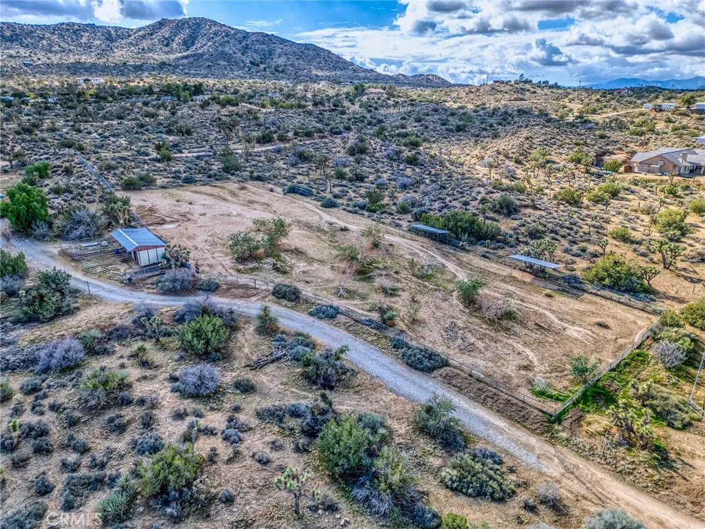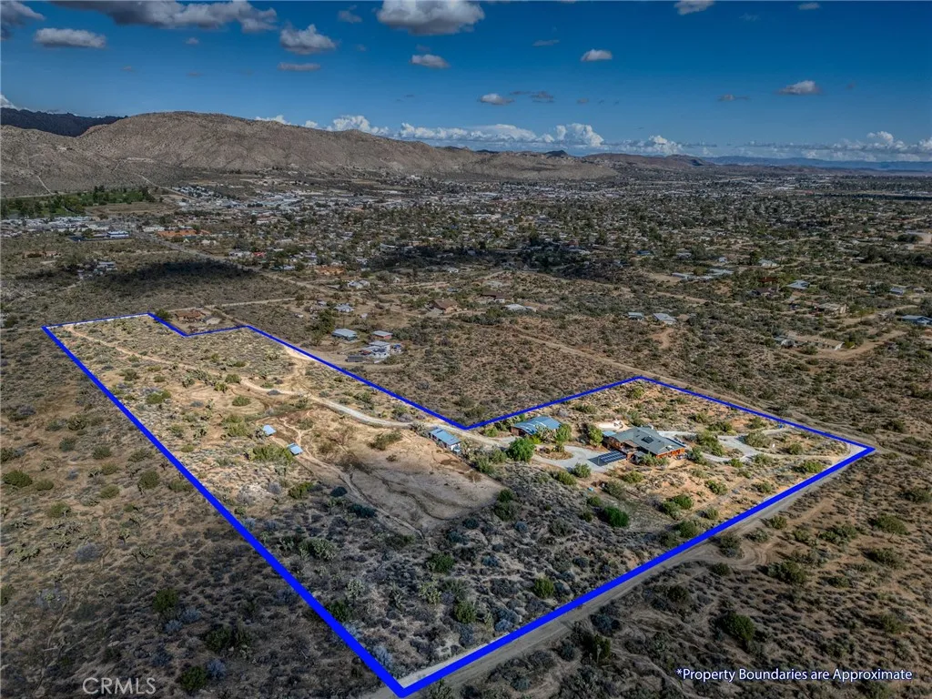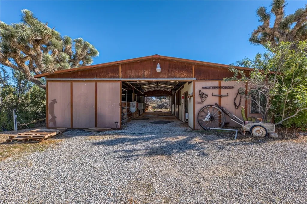 A Desert Artists Retreat on 11.69 Acres of Pure Inspiration. Discover one of the most unique and captivating properties in the entire Morongo Basin, a stunning wood-constructed desert retreat set on 11.69 acres of spectacular land with panoramic mountain and desert views in every direction. Properties with this level of land, privacy, and craftsmanship are exceptionally rare. Step inside and immediately feel the warmth of the exposed wood-beam construction, a hallmark feature that brings character, authenticity, and artistry to every room. Expansive windows fill the home with natural light and frame the ever-changing desert scenery, creating a truly inspiring atmosphere. The spacious kitchen opens seamlessly to the dining and living areas, making it ideal for gatherings or quiet evenings at home. The primary bedroom continues the wood-beam theme with rich ceilings and a custom en-suite bathroom featuring a one of a kind shower and bath design. Every space feels intentional, inviting, and unlike anything else on the market. Outside, multiple wood decks and patios provide perfect spots to soak in the desert sun, entertain guests, or simply unwind as the sky turns brilliant shades of pink and orange. A pool and spa, currently drained and unused for years, await your vision to restore them into an oasis once again. The expansive acreage stretches from Mountain View to the next street south and includes multiple barns and arenas, offering endless possibilities, animals, car storage, creative spaces, or whatever lifestyle you envision. The main barn is especially versatile, ideal