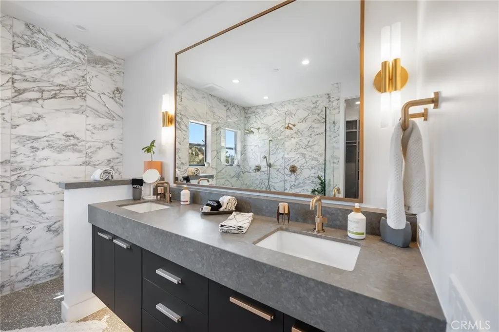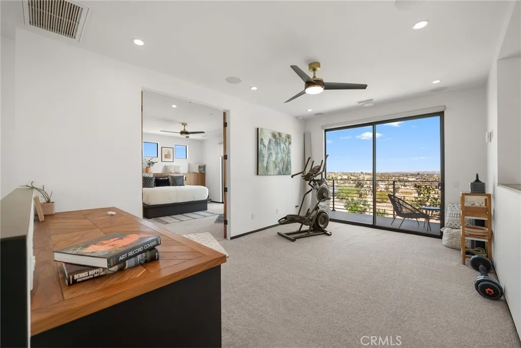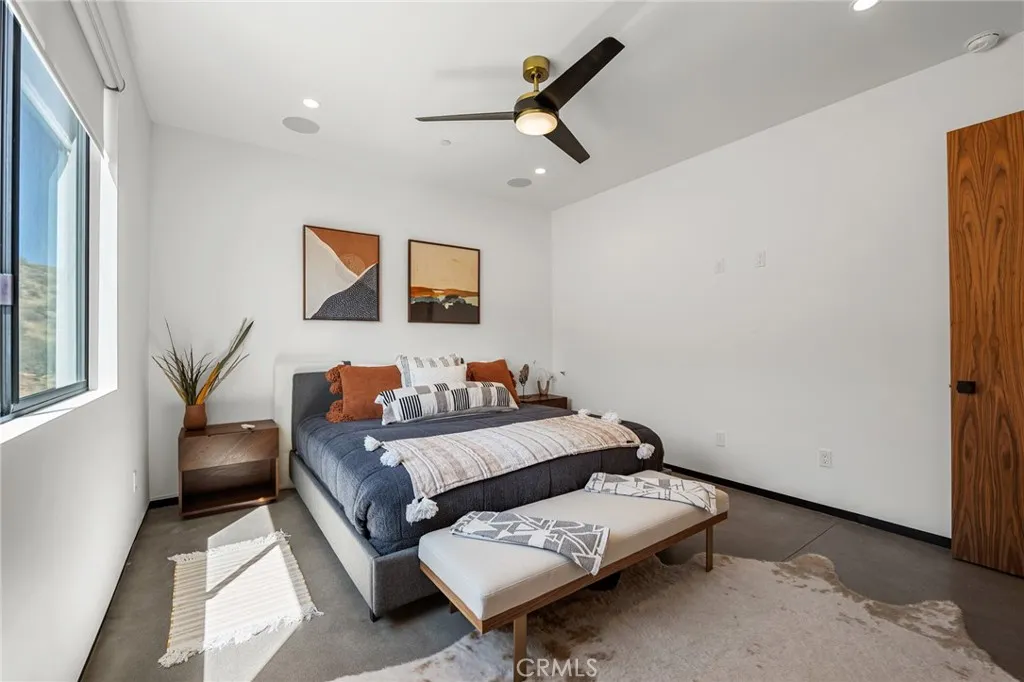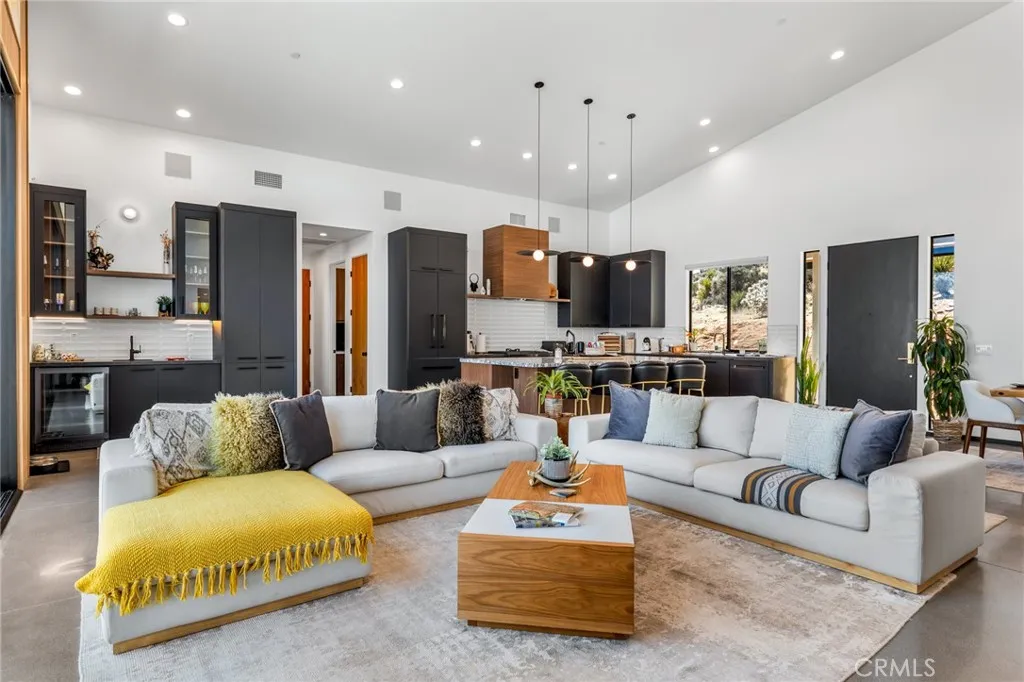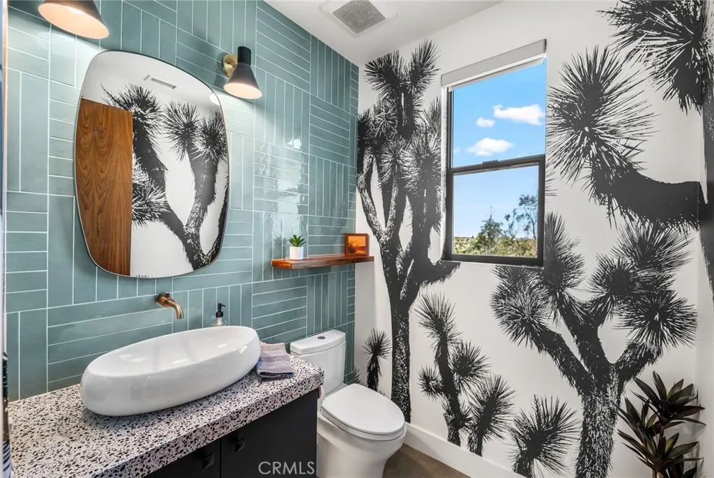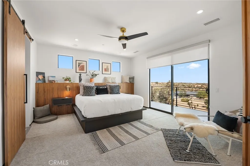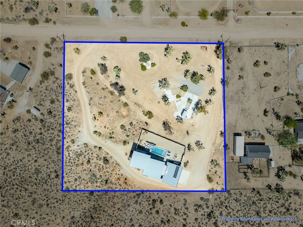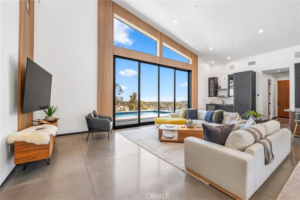 Here's a stunning desert estate, thoughtfully designed to blend modern architecture with the rugged beauty of its natural desert surroundings. Inside, an open-concept floor plan is awash in natural light, featuring clean lines and upscale finishes throughout. The sleek modern kitchen is outfitted with stone countertops, custom cabinetry, an integrated refrigerator, and top-tier appliances. The kitchen, dining, and living areas seamlessly flow together, all oriented toward panoramic sliding doors that frame expansive desert views to the north. Throughout the main level natural wood accents, black steel fixtures, and polished concrete floors establish a theme of refined, uncomplicated elegance, while each bathroom introduces a touch of contrast with copper fixtures, stylish deco and Marin tile backsplashes. Upstairs, a balcony overlooks the main living space and leads to the spacious primary bedroom, complete with a private bathroom, walk-in closet, and its own outdoor balcony to further soak in the surrounding desert vistas. Step outside and you'll find a sparkling pool and spa just beyond the main living areaperfect for indoor-outdoor entertaining. The outdoor space also includes a BBQ area and a built-in fire pit, ideal for relaxing under star-studded desert night skies. Tech-savvy folks will appreciate this Smart Home is equipped with whole-home audio, high-speed internet, and a security camera system. Ideally located just minutes from eclectic local shops, dining, Joshua Tree National Park, and Pioneertown. This home is a must-see to truly appreciate!