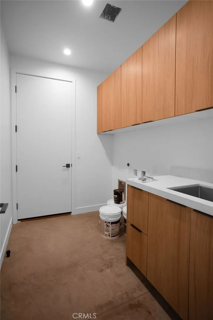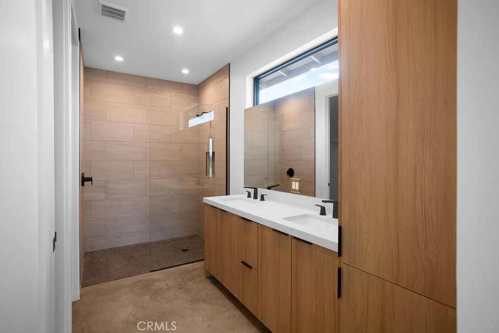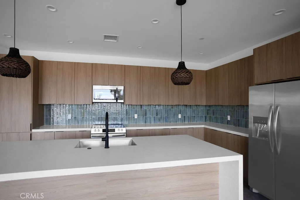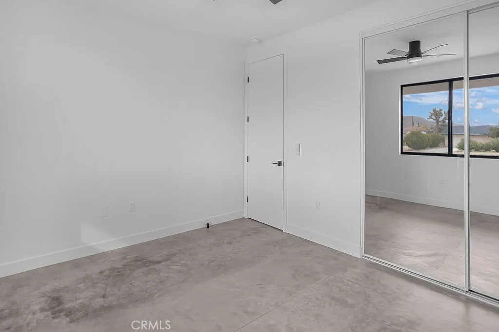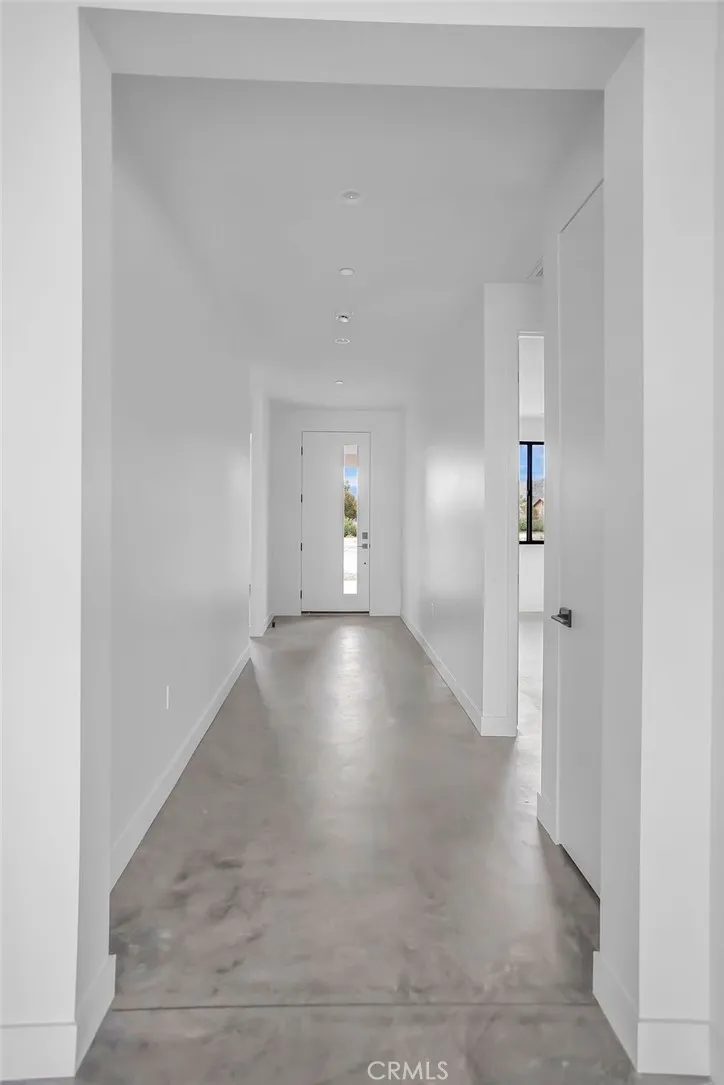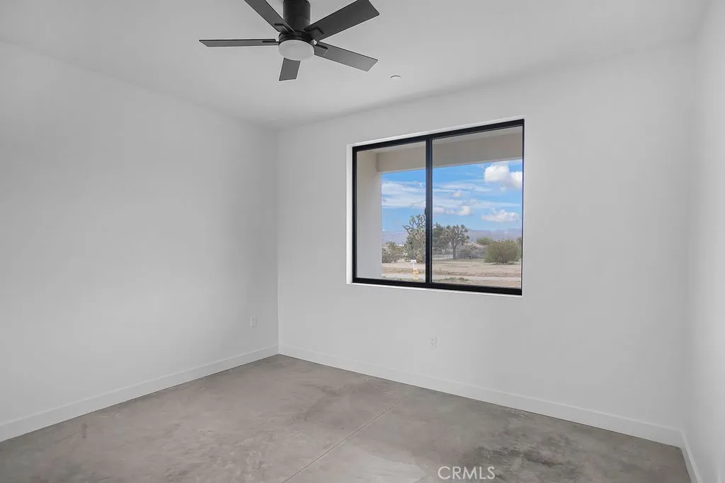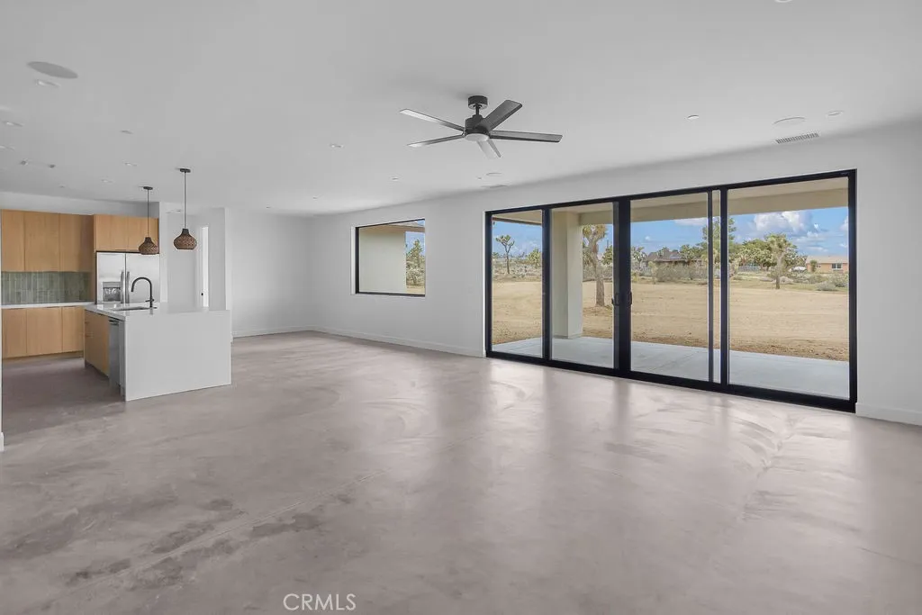 Modern desert architecture meets clean-lined minimalism in this newly built 2,047 square foot residence set on a 29,950 square foot parcel in Yucca Mesa. The design is intentional from the moment you enter. Polished concrete floors run throughout, creating a seamless visual foundation that pairs with warm natural wood cabinetry and matte black hardware. Expansive black-framed sliding glass doors open the living space to a covered patio, blending indoor and outdoor living against a backdrop of desert sky and mountain views. The kitchen anchors the home with a waterfall-edge island, quartz countertops, full-height artisan tile backsplash, stainless steel appliances, and integrated storage. Pendant lighting and recessed fixtures provide layered illumination while maintaining the homes clean aesthetic. The primary suite offers a refined retreat with a custom-tiled walk-in shower, dual vanity, and modern finishes. Secondary bedrooms are thoughtfully positioned for privacy and flexibility. A dedicated laundry room with built-in cabinetry and utility sink enhances functionality. Owned solar contributes to energy efficiency and long-term savings. As new construction, the home benefits from updated systems, materials, and contemporary design throughout. Located in Yucca Mesa, known for its spacious parcels and open desert surroundings, just a short drive to dining, shops, and community events, and convenient access to Joshua Tree National Park. Buyer to verify all information including square footage, utilities, zoning, and solar specifications.